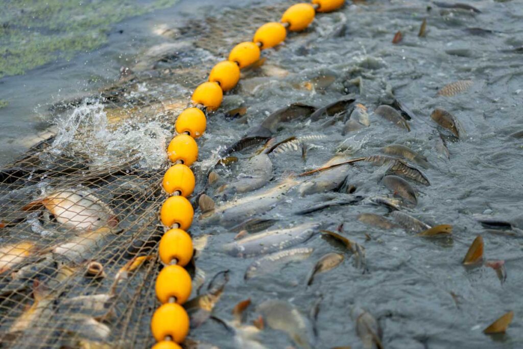 Riba se izlovljava pomoću specijalnih mreža, a potom se sortira i prebacuje u manje zimnjake, gdje čeka distribuciju prema kupcima.