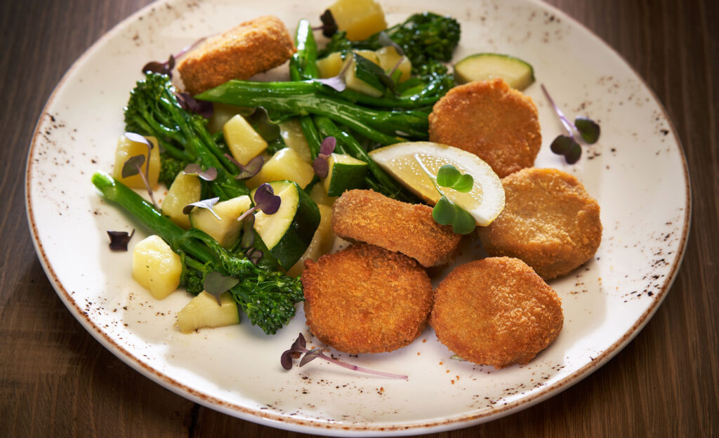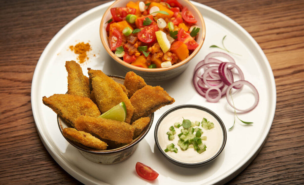 Panona Mare Fishchips pikant za prste polizati Fishchips pikant s pečenim povrćem iz pećnice, pinjolima i